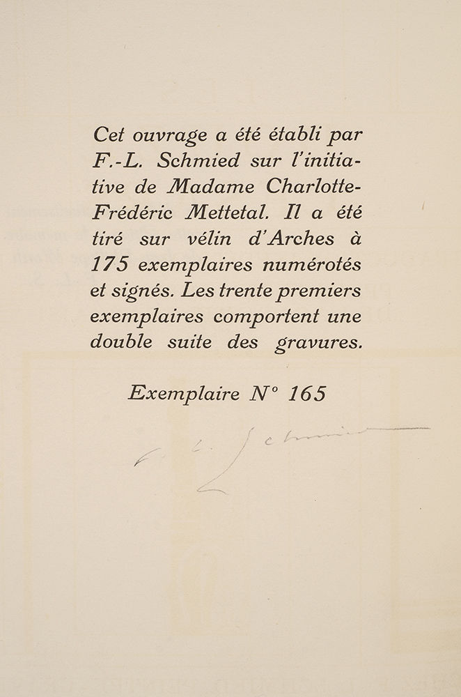 Limited to 175 copies printed on vélin d'Arches (this being no. 165) signed by F.L. Schmied.