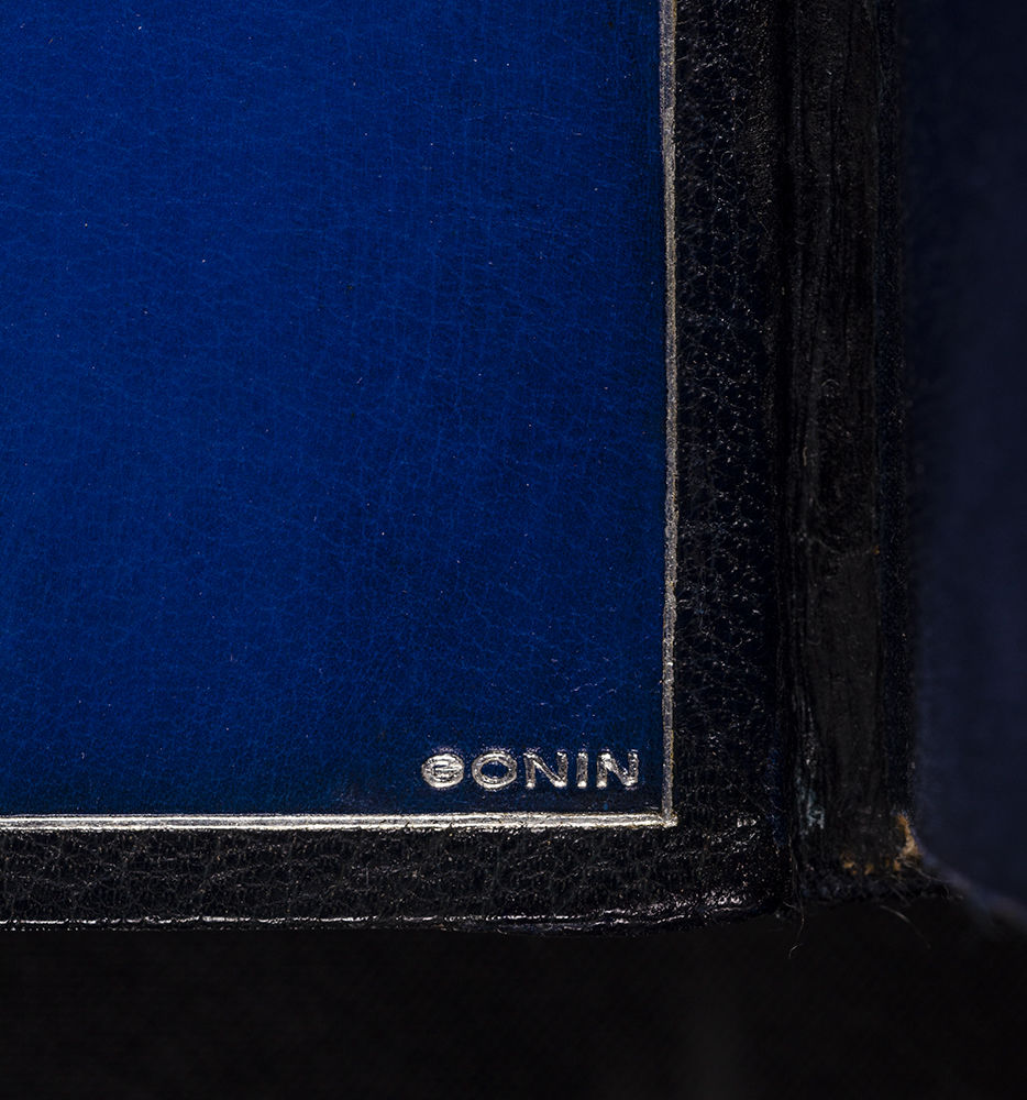 Bound ca. 1928 by Phillipe Gonin (stamp-signed in gilt on front doublure) in full dark blue crushed levant morocco, smooth spine lettered in gilt, medium blue calf doublures, dark blue watered silk endleaves, top edge trimmed, others uncut. Joints expertly and almost invisibly repaired.
