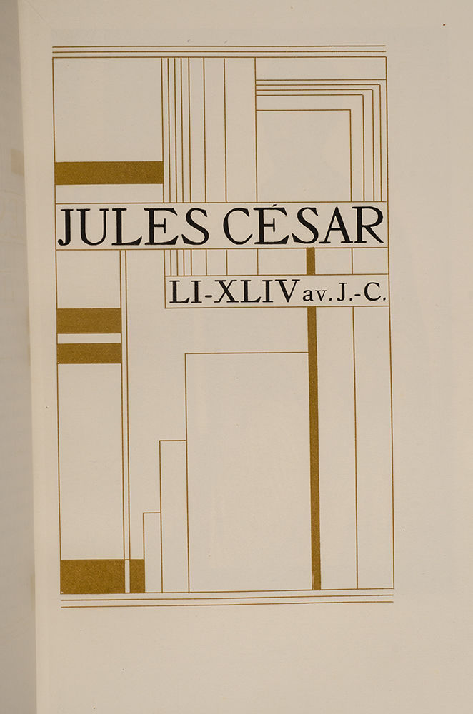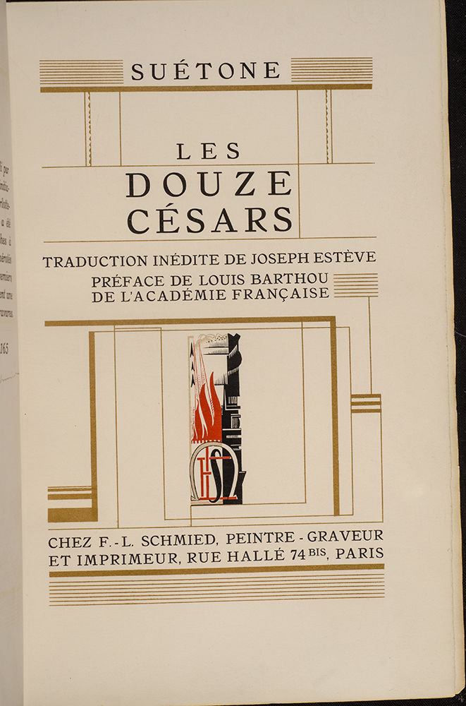 "In addition to engraved portraits of the Caesars, Schmied decorated the book with some elaborate designs in rules, printed in gold. One hundred and seventy-five copies were printed of which the first thirty copies contained suites of the illustrations in black and in color." (Ward Ritchie. Art Deco. The Books of Francois-Louis Schmied, p.32).