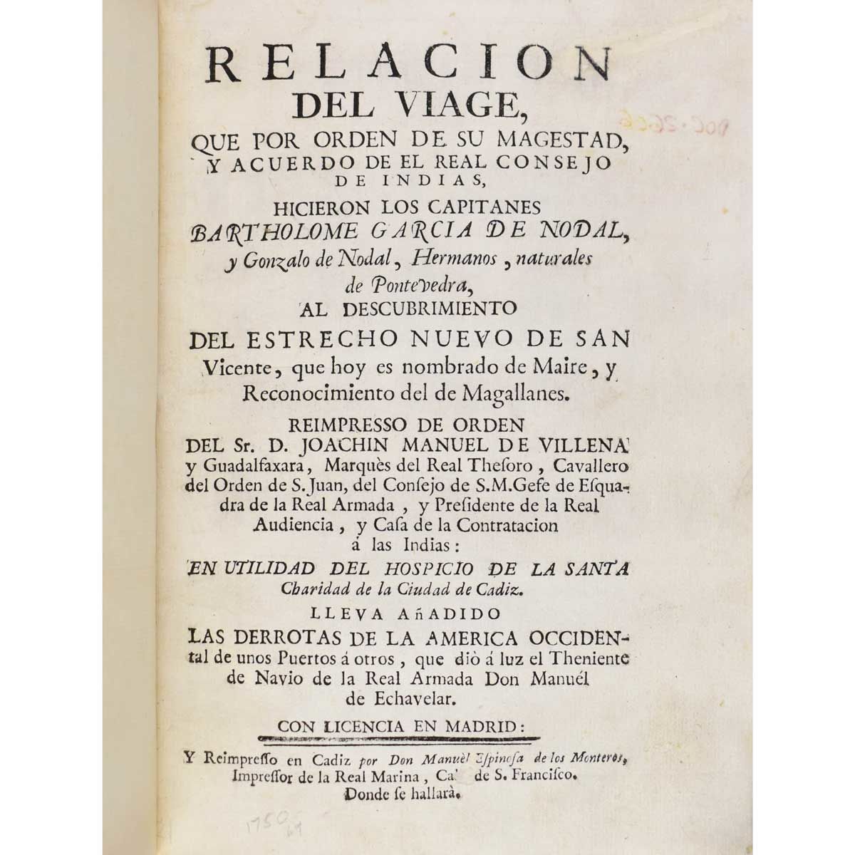 Hill describes the first edition, printed at Madrid in 1621, as 'one of the rarest books on voyages of the seventeenth century ... Copies containing the map are so rare that it is believed to have been suppressed in accordance with the official Spanish policy of secrecy'. 'The work gives an account of the Spanish expedition sent out by order of Philip III, immediately after the return of Schouten's expedition, for the exploration of the Magellan Straits.