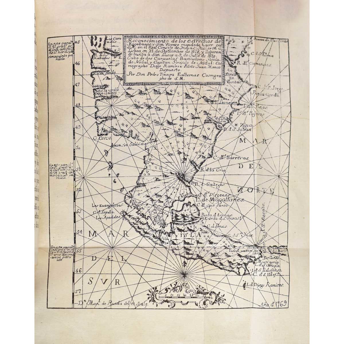 This map illustrates one of the most important discoveries in the history of world trade, the discovery of the Strait of Le Maire or, as the Nodal brothers christened it, the Strait of San Vicente. The Nodal expedition was a reconnaissance mission sponsored by King Philip III of Spain in 1619. The purpose was to confirm the recent discoveries of Jacob Le Maire and Willem Schouten of a passage from the Atlantic to the Pacific to the south of Tierra del Fuego.