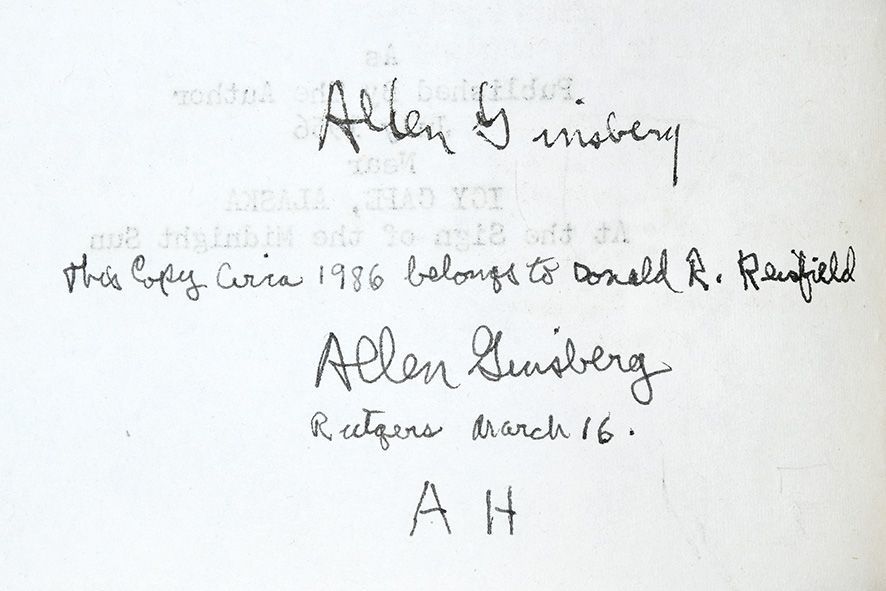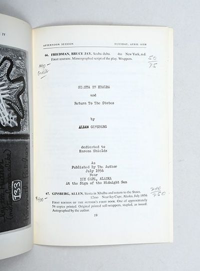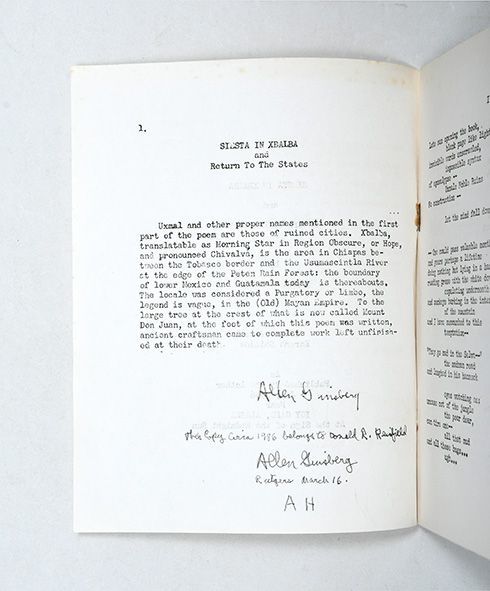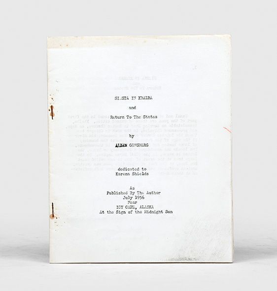 Icy Cape, Alaska: published by the author,, July 1956. One of few copies remaining in private hands, inscribed by Ginsberg First edition, sole impression, one of an estimated 53 copies, the author's second publication, and a renowned Ginsberg rarity, one of few copies remaining in private hands. This copy is signed twice by Ginsberg - once in his contemporary 1956 hand, and additionally inscribed "This copy circa 1986 belongs to Donald R. Reisfield / Allen Ginsberg / Rutgers March 16 / AH", both on the first text page. Siesta in Xbalba is a truly rare Ginsberg item, self-printed and self-published in the summer of 1956 while aboard a Navy ship off the coast of Alaska, before he returned to San Francisco and realized his literary destiny and fame as the author of Howl, which was published in November 1956 by Lawrence Ferlinghetti's City Lights. Upon printing this work, Ginsberg sent 13 copies to his publisher Lawrence Ferlinghetti, instructing him on 4 August 1956 to "[k]eep one yourself and put the other dozen on sale at 50 cents each if you think you can sell them. Give the proceeds to Mike McClure for us for Moby Magazine. You can advertise them as a charity type shot for Moby. I made up another forty and am keeping them or sending them out as whim strikes me" (Morgan p. 5). Ginsberg sent one such copy to his father, Louis, who responded encouragingly, "It's very interesting with cinematic flashbacks of scenes and people. There is entangled in your lines a nostalgia for the past and for ruins that make a pulpit for mortality. Congratulations!" (Miles, p. 206). Siesta in Xbalba is Ginsberg's second publication, preceded only by a printing of Howl in May 1956 in 25 copies. The poem, written during his travels in Mexico in 1954, is dedicated to Karena Shields, a historian and anthropologist whom Ginsberg met in the Palenque ruins during this trip. Shields lived on the cocoa plantation on which the ruins stood, and had written a number of scholarly papers on Mayan culture, and a popular book, Three in the Jungle (1944). Shields had lived in Palenque since the age of three and had discovered a number of lost cities in the area, meaning that "she was just the sort of person Allen needed to meet in order to see the real Mexico and when she invited him to visit her cocoa finca, he readily accepted" (Miles, p. 156). Siesta in Xbalba is a considerable rarity in the Ginsberg canon. Around 53 copies were produced - Ginsberg cites 53 in the above letter to Ferlinghetti, though 52 in another letter to Kerouac, which his bibliographer Morgan cites. The true figure is certainly not far removed, give or take a copy or two. Of these 33 are now held institutionally, and many others must have been lost leaving precious few available to collectors. A bare handful are recorded at auction or in the trade. This copy was sold in the Parke-Benet sale, "Modern and Avant-garde First Editions", 14 April 1970, lot 67; a priced catalogue is included, and original auction house envelope. Small quarto (204 x 165 mm), pp. 22. Mimeographed typescript, printed on both sides, stapled as issued. Together with auction catalogue (see note). Housed in a black quarter morocco solander box by the Chelsea Bindery. Slight rusting around staples, faint soiling to initial and terminal page, minor orange crayon mark to former, notwithstanding an excellent copy of a scarce and fragile production. Miles, Allen Ginsberg: Beat Poet, 1989; The Selected Correspondence of Lawrence Ferlinghetti and Allen Ginsberg 1955-1997, 2015; Morgan A2.