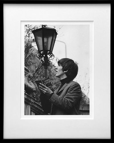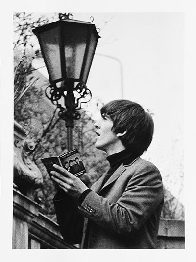 George Harrison signing a book in the walled garden of the Ambassadeurs Club, Mayfair.