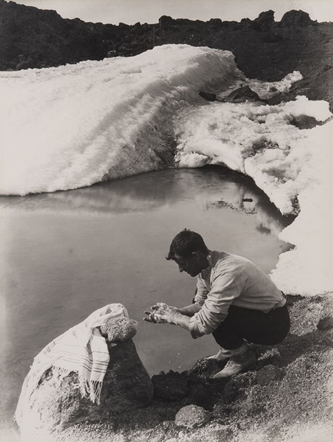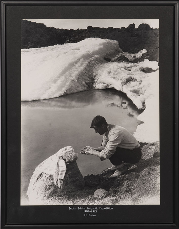 Classic Ponting photograph from Captain Scott's Terra Nova expedition (1910-1913), showing Lieut. Evans crouching down on his haunches washing his hands in the Antarctic sea. Evans, who rose to the rank of Admiral and who was raised to the Peerage as the first Baron Mountevans, served on the crew of the relief ship on the Discovery expedition and was planning his own Antarctic expedition when Scott offered him the post of second-in-command of the Terra Nova expedition.