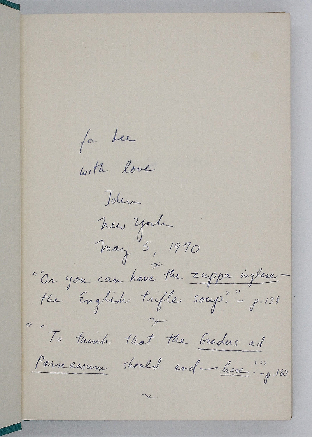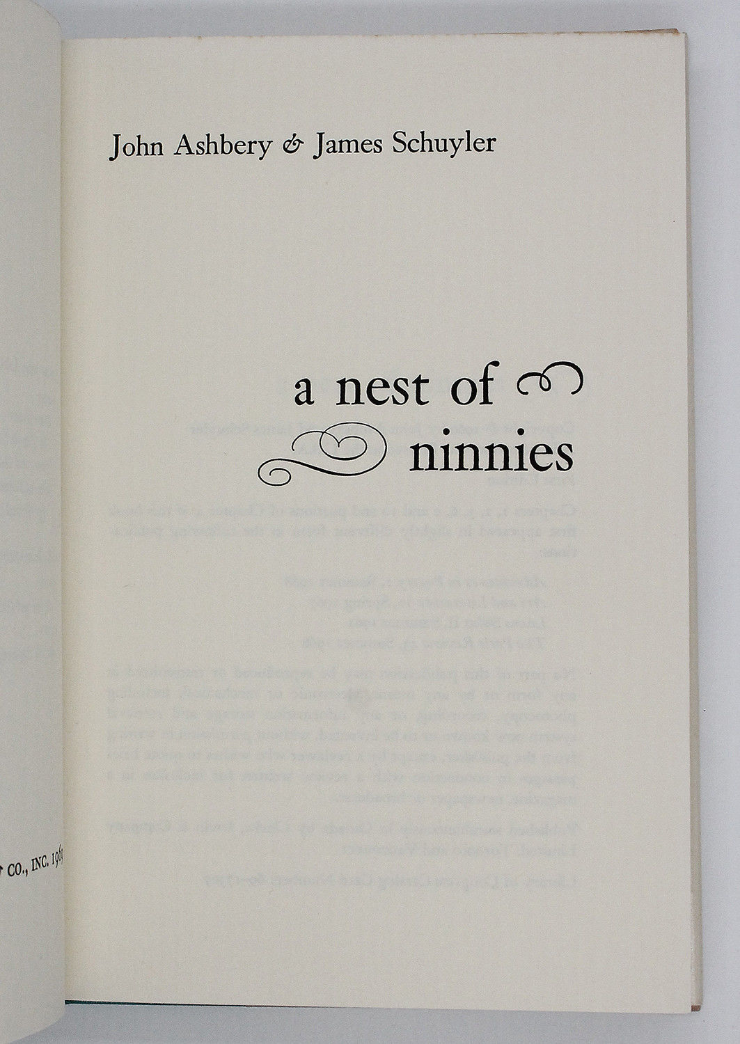 New York: E. P. Dutton and Co. 1969. First edition, first printing. First edition, first printing. Signed by the author. Inscribed association copy (Lee Harwood's copy). Original quarter turquoise cloth over lavender boards lettered in metallic lavender to the spine, in the dustwrapper designed by James McMullan. A fine copy, the binding square and firm, the contents bright and clean throughout. Light spotting to the upper edge, three or four spots to the fore-edge. In the near fine dustwrapper, a touch rubbed to spine tips and corners with a half-centimetre closed tear to the upper corner of the rear flap. A lovely association copy of Ashbery and Schuyler's jointly-authored novel. Inscribed and lined by Ashbery in blue ink to the front free endpaper, "For Lee / with love / John / New York / May 5, 1970", followed by two quotations (also in Ashbery's hand) from the novel, with page numbers: "'Or you can have the zuppa inglese the English trifle soup'. p.138" and "'To think that the Gradus ad Parnassum should endhere'. p. 180". The recipient is the English poet Lee Harwood (which may explain the first quotation). Ashbery lived in Paris for most of the 1960s, but the two poets first met in London. As Harwood recounts: "It was about 1965. [Ashbery] came over from Paris he was working [...] and writing art columns for the Herald Tribune and did a reading at the US embassy, and I went along. I was impressed but I wasn't quite sure what was happening there. Then afterwards there was a party and I got to know him there, and after that I went over to stay with him several times in Paris. Then he had to move back to the States. In the mid- to late 60s I was spending a lot of time going back and forth to New York, and I usually stayed with him. A lovely warm friendship built up between us." The two were, for a while, lovers (Harwood's volume, The Man with Blue Eyes (1966) is a chronicle of sorts of the affair the two poets conducted between 1965 and 1966). Although Harwood was the "junior" figure, poetic influence was clearly exerted in both directions, Harwood one of a handful of contemporary English poets that became important to Ashbery (F. T. Prince and Mark Ford the two others examined in Old Hazzard's monograph, 'John Ashbery and Anglo-American Exchange' [Oxford, 2018]). 'A Nest of Ninnies' is that rare thing, a novel truly written by two authors. In his Ashbery bibliography, David Kermani prints part of an unpublished interview where Ashbery describes the novel's genesis: "in 1952 [,] we [Ashbery and Schuyler] were [regularly] being driven into New York from the Hamptons [...]. We were in the back seat trying to think of something to amuse us, and Jimmy suggested we write a novel. I said how could we do that, and he said, 'Oh it's very simple.' He pulled out a pad and said, 'Think of a first line.' So I did, and he thought of the second line. We proceeded along that way, gathering inspiration from the suburban countryside we were going through. We went past a house in Smithtown and decided that it would be a very good place for the characters to live. But we never had any intention of finishing it, much less publishing it. We would put it aside for years on end and take it down and do some more. There was a period of seven or eight years in which we didn't do anything on it at all, because I never saw Jimmy while I was living in Europe.... We started out [writing alternate lines] but then we felt it was too hampering. If somebody thought of a good line to follow the one he had just written, there was no reason why he couldn't just throw it in. As we went on we started writing longer passages alone. But it did seem to require us being together; we once tried to do it by correspondence, but it just didn't work at all; it lacked a sort of hand-made quality." The resulting work is at very funny and very literary, an American novel of manners which, as Mark Ford has written, owes its particular brand of high camp to England, to Firbank and Ivy Compton Burnett. The novel, whose title comes from Robert Armin's Jacobean jest book, (the ninnies here are upper-middle class surburban American ninnies) didn't receive much critical attention, the one generous review coming from W. H. Auden in the New York Times (4 May, 1969), "Like many folk tales, the idylls of Theocritus, the 'Alice' books, 'The Importance of Being Earnest,' the novels of Firbank and P. G. Wodehouse, 'A Nest of Ninnies' is a pastoral: the world it depicts is an imaginary Garden of Eden, a place of innocence from which all serious needs and desires have been excluded." The jacket, unexpectedly, features a blurbs from Ned Rorem and, more unexpectedly, Anthony Burgess ("Very neat and funny andfor a foreigner lie myselfmost informative of American life today"). Published 7 March, 1969 in an edition of 6000 copies. (Mark Ford, 'No one else can take a bath for you', LRB, 31 March 1988; Kermani A14). Further details and images for any of the items listed are available on request. Lucius Books welcomes direct contact with our customers.