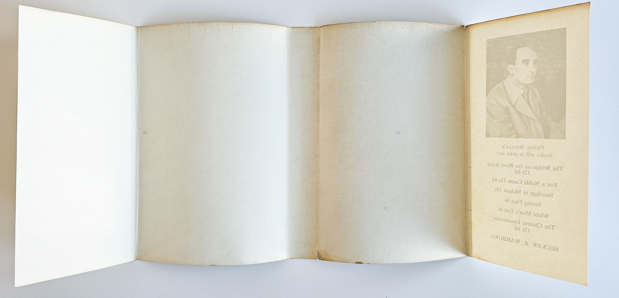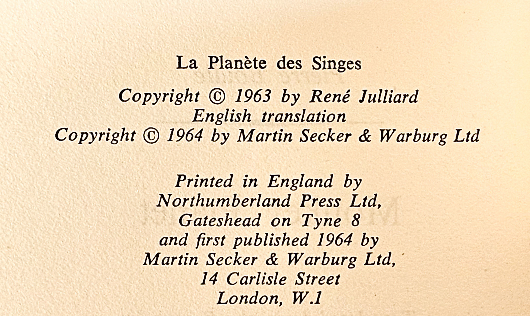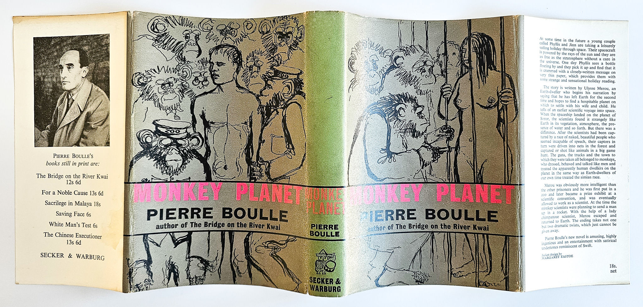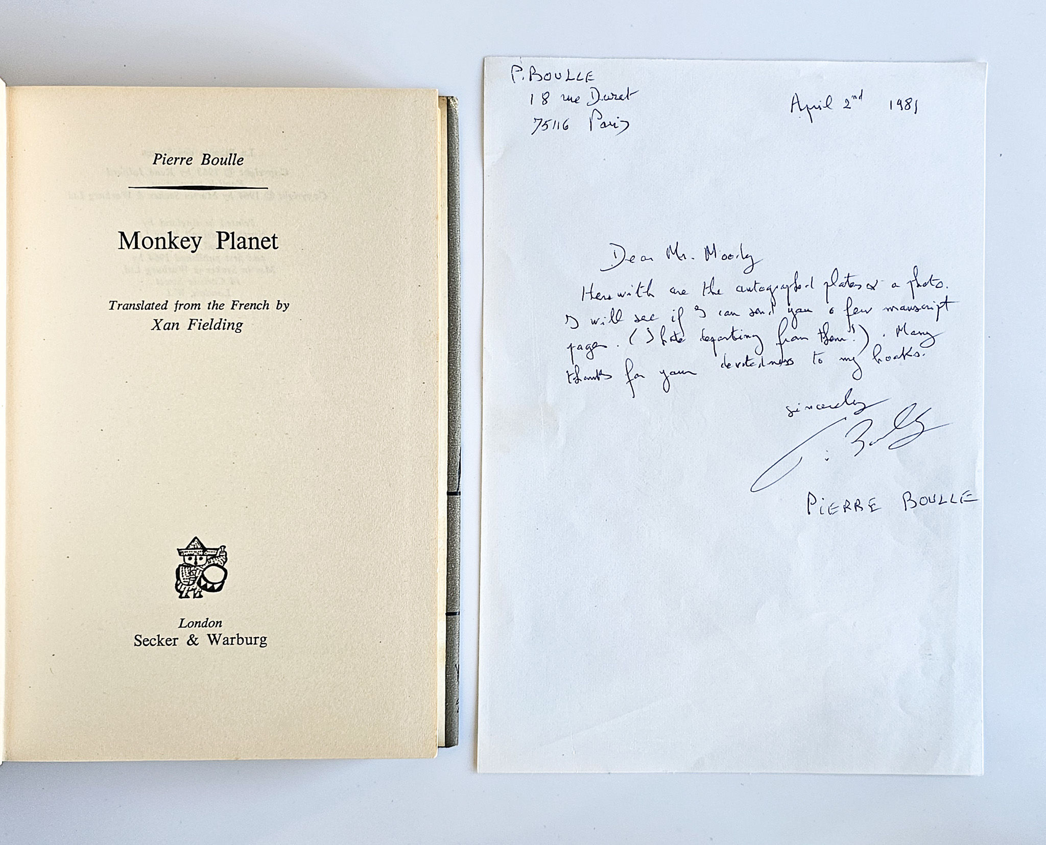 First UK edition, first impression, published by Secker and Warburg in 1964. First published in French under the title 'La Planète des Singes' in 1963. The basis for the 1968 science fiction classic film adaptation 'Planet of the Apes'. Accompanied by a typed letter signed ("Pierre Boulle") dated April 2nd 1981, discussing autographed material, manuscript pages and thanking the recipient for their devotedness to his books.