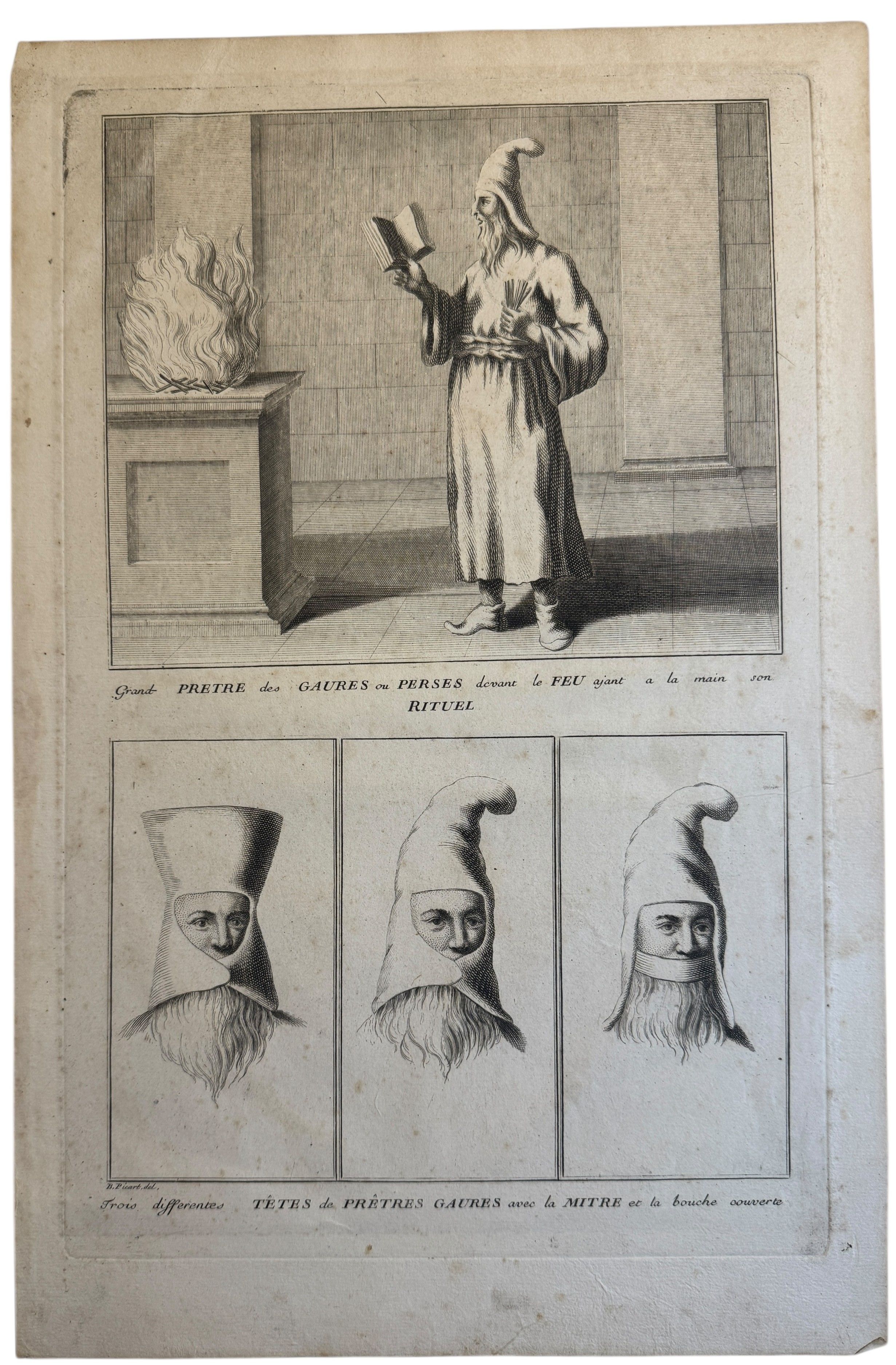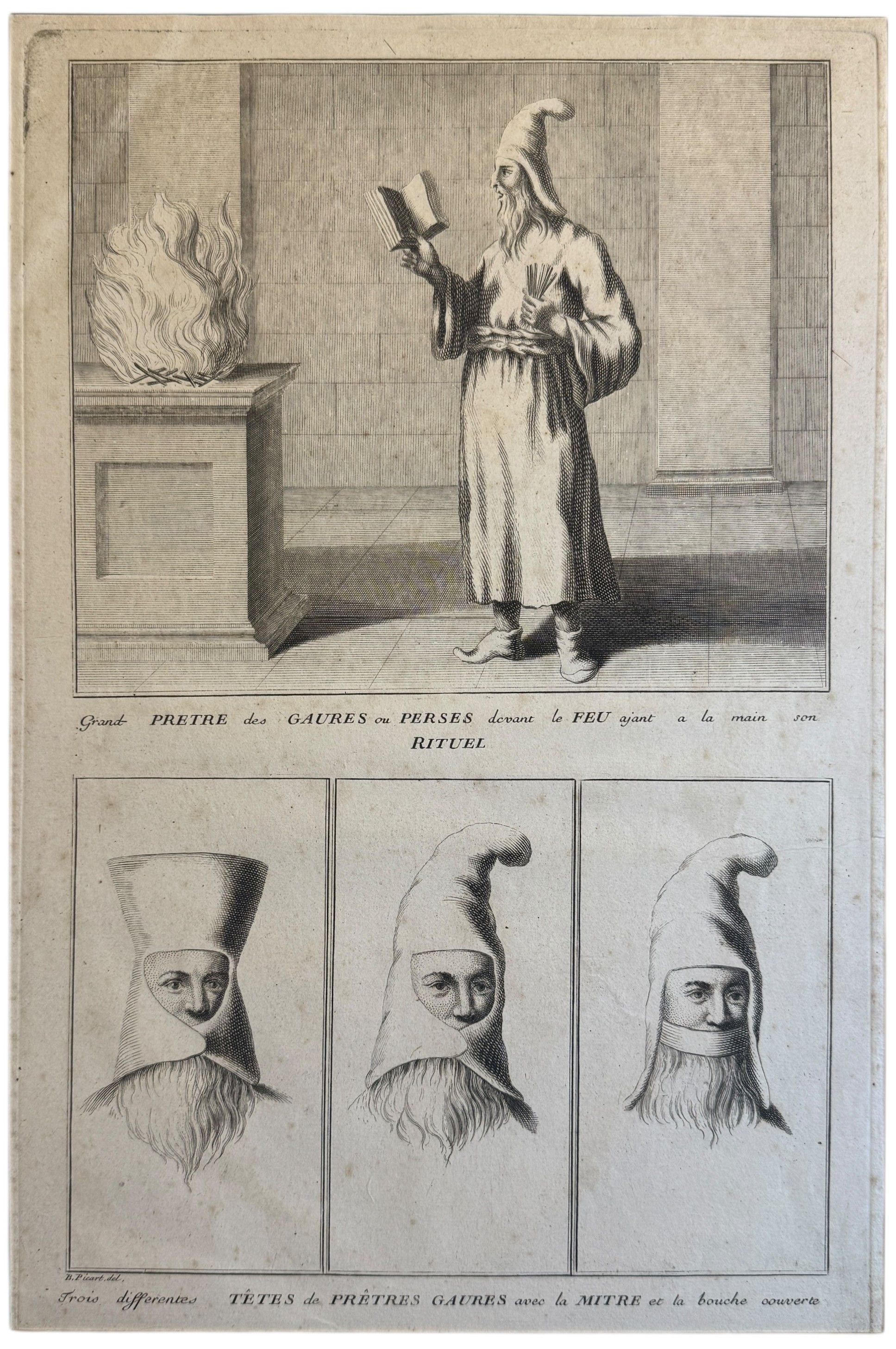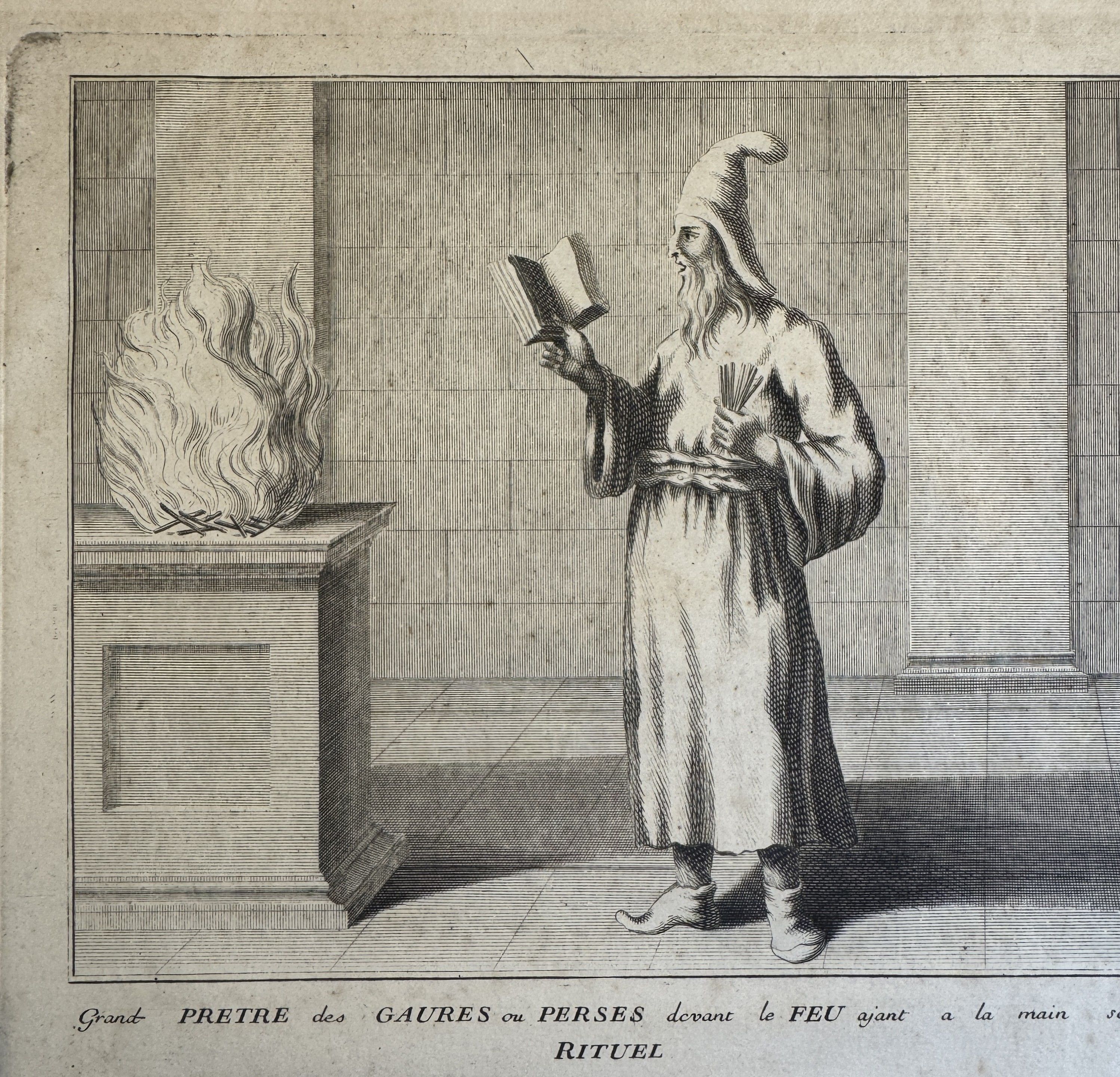 Grand prêtre des Gaures ou Perses devant le feu ayant à la main son rituel.