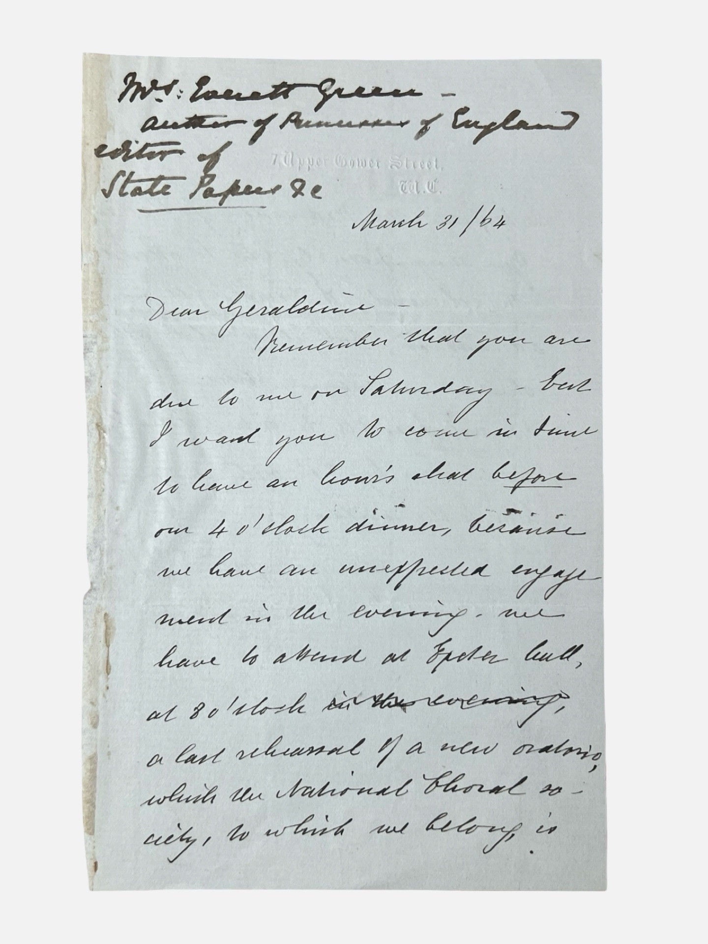 Autograph letter signed by historian and editor Mary Anne Everett Green (1818-1895)