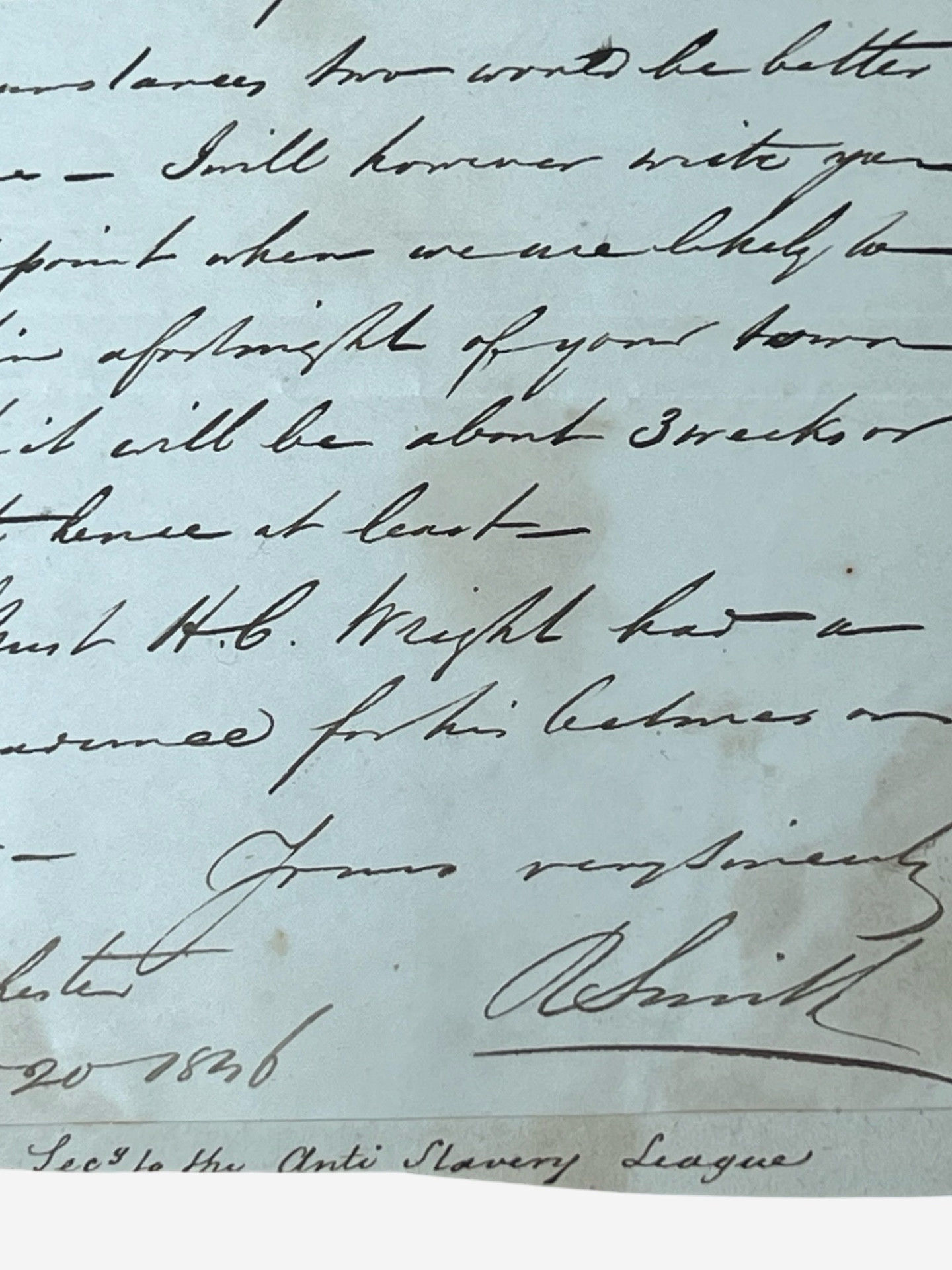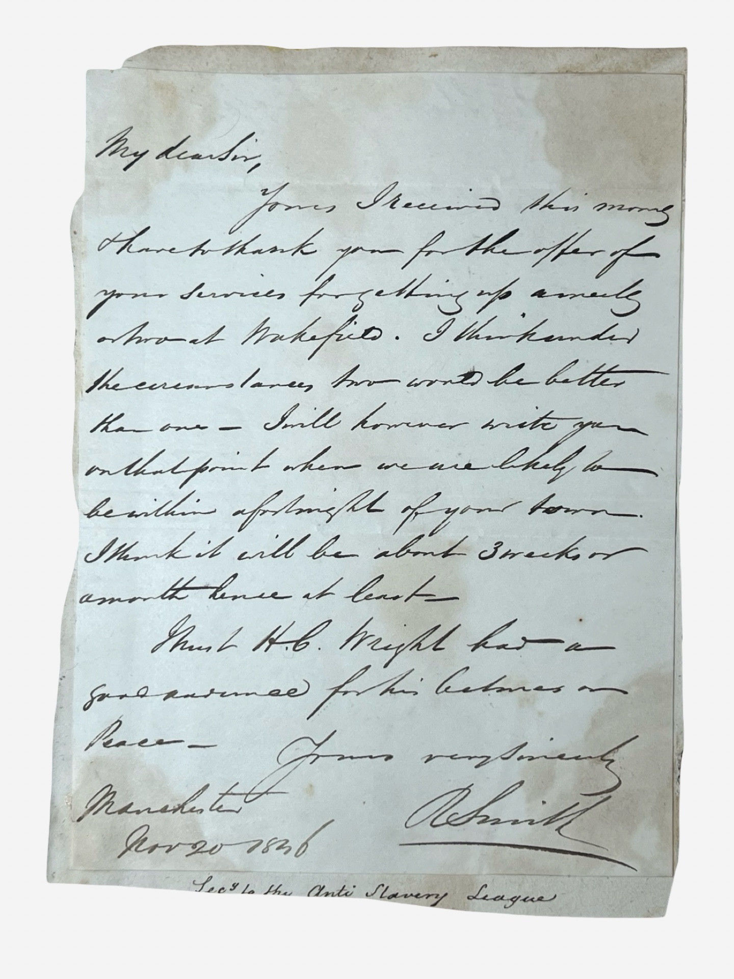 Autograph letter signed by Abolition / Anti-Slavery League secretary Robert Smith about a meeting involving Henry Clarke Wright (1797-1870)