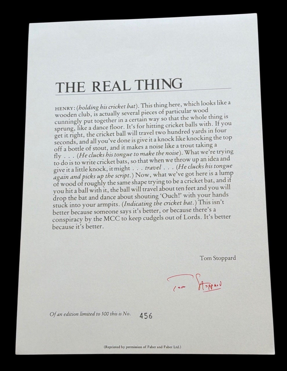 'The Real Thing’ : A Broadside From The 1982 Play ‘The Real Thing’ : The Famous Cricket Bat Speech : Numbered Limited Edition Of Only 500 Copies, Each Signed By Sir Tom Stoppard