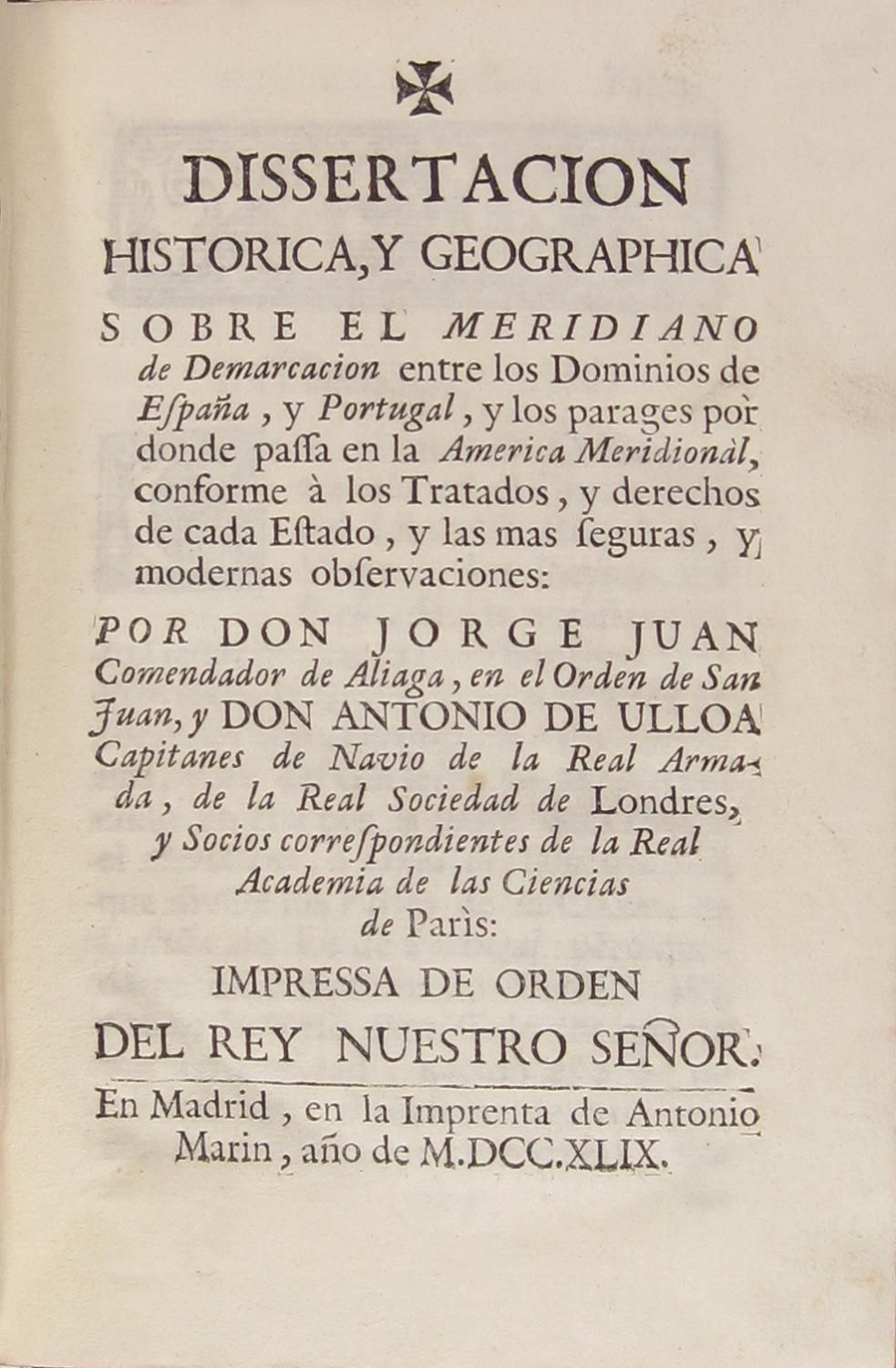 Dissertacion historica, y geographica sobre el Meridiano de Demarcacion entre los Dominios de España, y Portugal, y los parages por donde passa en la America Meridional, conforme à los tratados, y derechos de cada estado, ylas mas seguras, y modernas observaciones. Por ....