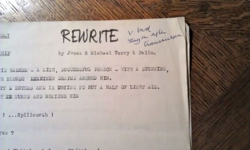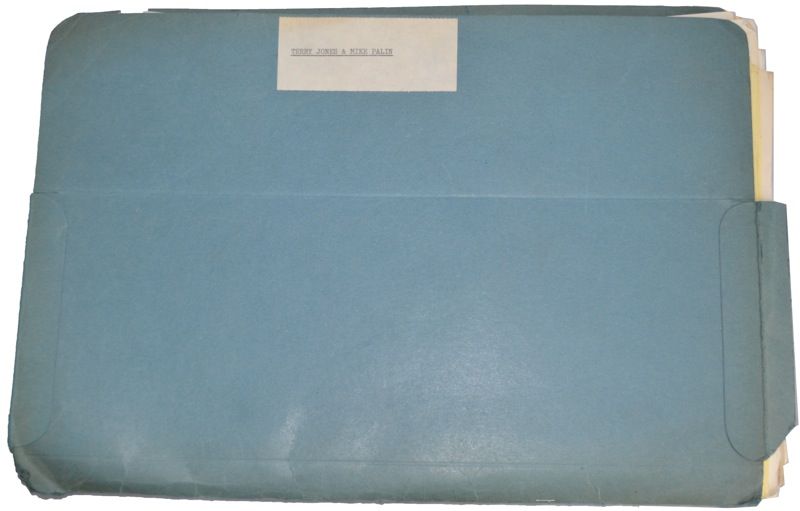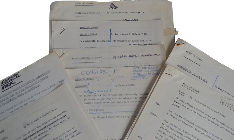 N.p. [London]: N.p. 1967-8. A small quantity of original typescripts, printed typescripts and photocopied typescripts, many secured with staple to top left corner, and many with handwritten amendments, additions and deletions. Housed in a blue card folder bearing a typed white paper label label reading TERRY JONES & MIKE PALIN. Some wear and toning consistent with their age, staples mostly rusted, otherwise in near fine condition. A SMALL QUANTITY OF ORIGINAL, PRINTED AND PHOTOCOPIED TYPESCRIPTS OF SKETCHES WRITTEN BY TERRY JONES AND MICHAEL PALIN FOR FROST ON SUNDAY AND THE FROST REPORT, WITH EXTENSIVE CORRECTIONS, AMENDMENTS AND REWRITES BY BOTH. Terry Jones and Michael Palin first met as undergraduates at Oxford and, after graduating, began writing together for TV comedy shows. All the future Pythons save Terry Gilliam worked together for the first time on The Frost Report (1966-7), which also featured, both as writers and performers, Ronnie Barker and Ronnie Corbett. The show ran for twenty-eight episodes over two series, and launched everyone who was to be anyone in British comedy for the next twenty years. Less well-known but just as formative for those who worked on it, Frost On Sunday ran for thirty-six episodes between 1968 and 1970. It again featured the two Ronnies, and featured among its writers Barry Cryer, David Nobbs, Esmonde and Larbey, Dick Vosburgh, Neil Shand -- and Jones and Palin, once again writing as a team. Although the programme only ever credited the pair as writers on two late episodes, the material offered here shows that the pair were an integral part of the team from the show's beginning. This remarkable collection features one sketch written for The Frost Report.; most of the rest of the material was written for Frost On Sunday. Many episodes of the show were wiped and are now presumed lost; the surviving material has been released on a 3-disc DVD distributed by Network. A UNIQUE COLLECTION OF ORIGINAL SKETCH MATERIAL BY TWO OF BRITAIN'S BIGGEST COMEDY NAMES, WRITTEN JUST BEFORE THE BIRTH OF MONTY PYTHON. The sketches for Frost On Sunday, all typescripts, are headed FROST ON SUNDAY unless otherwise stated, followed by either 'by Terry Jones & Michael Palin' or 'by Jones & Palin', and are as follows: -- Julie Andrews. 3pp. 2 copies. i) Original typescript written for Palin to perform with Ronnie Corbett (specified in text). ii)Photocopied typescript, earlier draft, with pencilled amendments in Palin's hand to first page. Dated 22 July 1968. -- Political Commentator. 1p. 2 copies, one typescript and one photocopy, the latter heavily rewritten in Palin's hand. Dated 31 July 1968. -- Holidays. 2pp. 2 copies, one typescript and one photocopy Dated 1 August 1968. -- The New Breed. 2 copies, 2pp. and 3pp. Printed typescripts, same text but differently set. 2pp. version dated 8 August 1968. Other undated. -- Olympics Selection. 2pp. Printed typescript, written for Palin to perform with Ronnie Corbett (specified in text). Dated 14 August 1968. -- The Friendly Postman and The Friendly Postman Mark II (two copies). 2pp. each. Original typescripts and a printed typescript, significantly different drafts of the same sketch, written for Ronnie Corbett to perform (specified in the text). Four minor handwritten corrections to the first draft, one to the second, and two to the printed copy. All three headed FORST [sic]ON SUNDAY; both dated 15 August 1968. -- New University. 1p. Original typescript. Three small handwritten corrections, inked ticks and question marks to margin. Dated 21 August 1968. -- Nixon. 2pp. Printed typescript. Dated 22 August 1968. -- Cricket Commentators. 3pp. Photocopied typescript, with numerous rewrites in Palin's hand in blue biro. Dated 27 August 1968. -- Argyll And Sutherland Highlanders (film). 2pp. Original typescript. Inked ticks, crosses and question marks to margin, otherwise unmarked. Dated 27 August 1968. -- Opening Speech. 1p. Photocopied typescript. Dated 11 September 1968. -- Monologue For His Good Self (three copies). 2pp. each. i) Original typescript. ii) Printed copy, with pencilled deletions and corrections (and a doodle in top right hand corner of p. 1), all in Jones' hand. iii) A second printed copy, unamended, on yellow paper. All three dated 11 September 1968. -- Wedding. 4pp. Original typescript (pp. 1-2) and printed typescript (pp. 3-4). Extensively amended in pencil in Palin's hand. With a second copy, printed typescript on yellow paper. Both dated 11 September 1968 -- Gone With The Wind. 3pp. Printed corrected typescript. Dated 18 September 1968. -- Trade Figures. 2pp. Two copies. i) Original typescript. ii) Printed typescript, heavily amended by Palin , the amendments mostly blue-pencil deletions. Both dated 19 September 1968. -- The Considerate Doctor. 3pp. Original typescript. Minor handwritten amendments (parentheses, deletions etc.). Dated 19 September 1968. -- The Spy. 2pp. Photocopied typescript, marked '12 copies' at top right hand corner of first page. WRITTEN FOR RONNIE BARKER AND RONNIE CORBETT (specified in text). Dated 2 October 1968. -- Lavatory. 2pp. i) Original typescript. WRITTEN FOR RONNIE BARKER AND RONNIE CORBETT (specified in text). No programme heading. ii) 4pp. camera script of the sketch from the show, probably Series 1 Episode 11, broadcast on 13 October 1968. -- The Weapons Expert. 1p. Original typescript, WRITTEN FOR RONNIE CORBETT (specified in text). Dated 16 October 1968. -- One Downmanship. 3pp. Written by Jones and Palin with Michael Terry. Original typescript, WRITTEN FOR RONNIE BARKER AND RONNIE CORBETT (specified in text), and marked REWRITE by Jones at top right hand corner. One handwritten stage direction added by Jones -- and, also in Jone's hand, a self-deprecating comment on the sketch to top right hand corner of first page: 'V. bad/ stay in after/ transmission'. Dated 2 October 1968. -- Scouting In The Modern Age. 1p. Original typescript, one red-line deletion. Written for Ronnie Bar